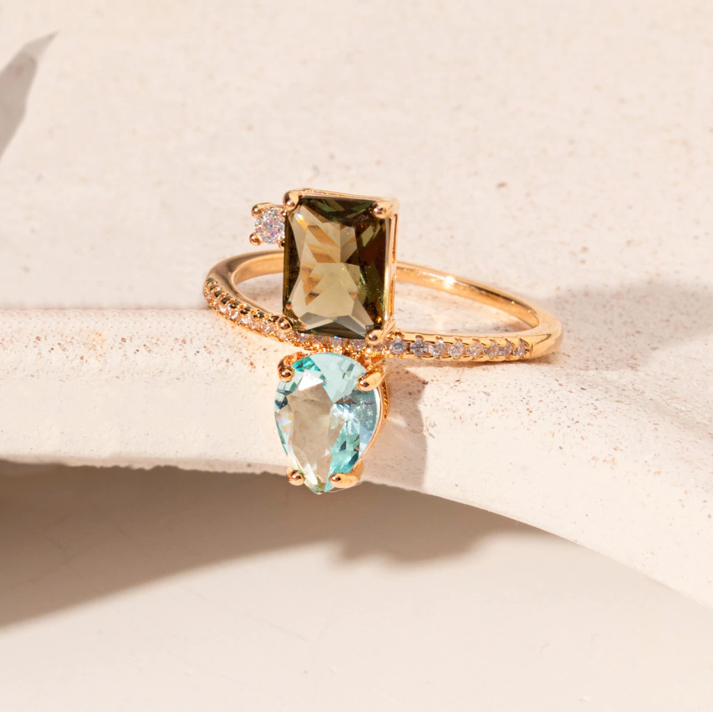 Anel cristais nas cores Verde Peridoto e Topázio Azul, aro em zircônias.