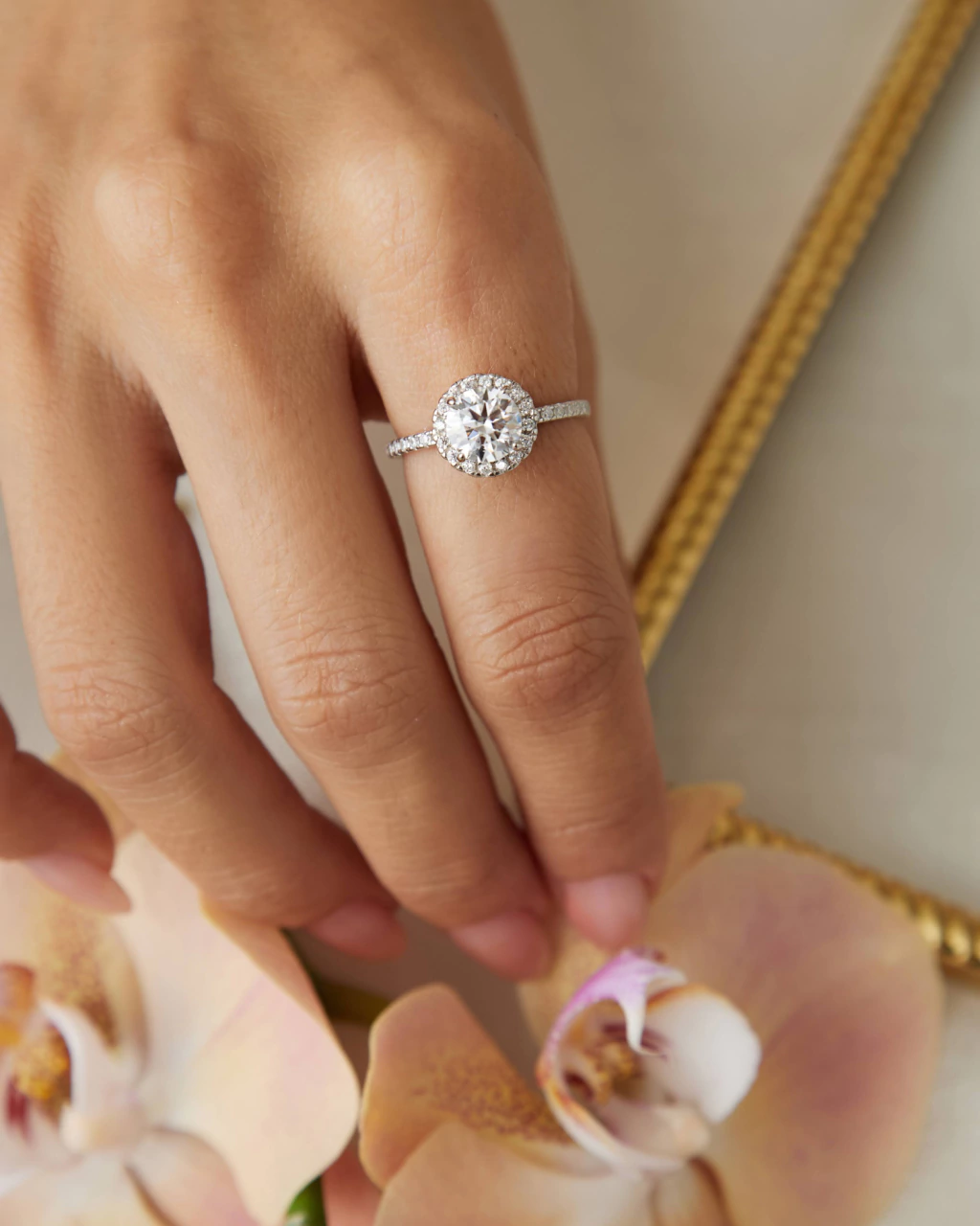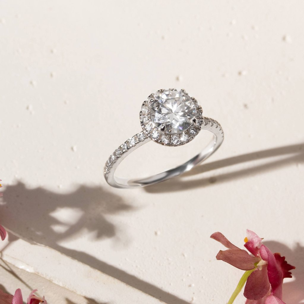 As Moissanites são da cor D, numa escala que vai de A (mais puro) a L (menos puro), característica comum na alta joalheria. Cada Moissanite é única, com um número de registro gravado na lateral da pedra e documentado em certificado, garantindo sua autenticidade.