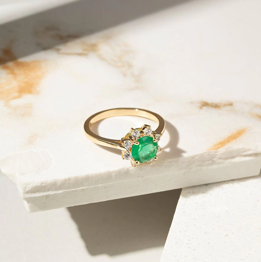 Anel clássico e elegante, com pedra fusion cor verde esmeralda.