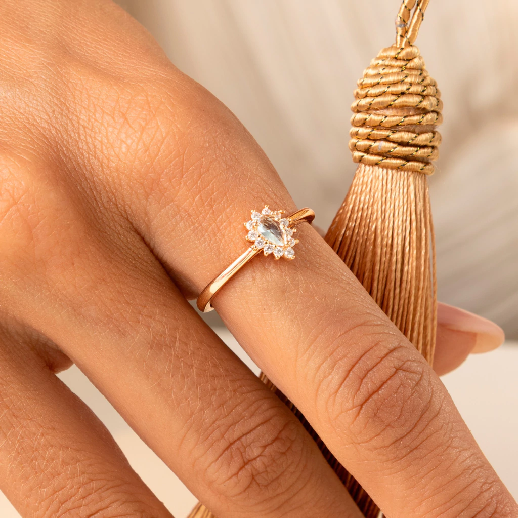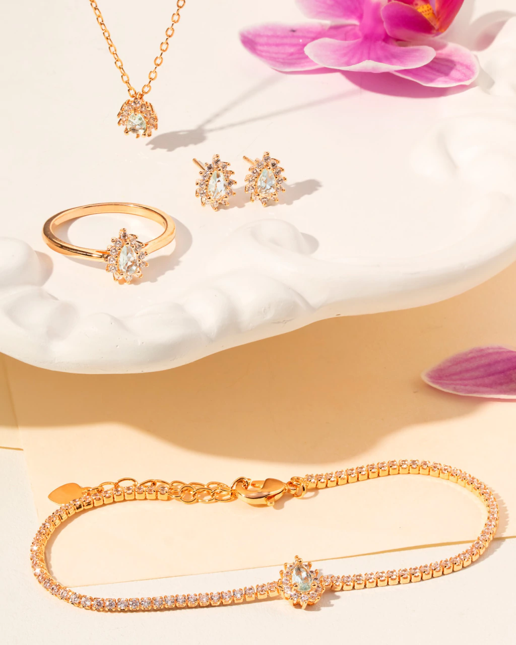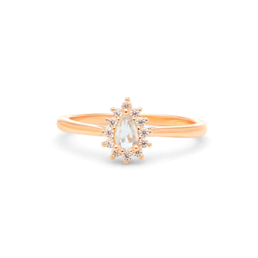 Gota central com cristal água marinha com zircônias, tamanho 8 x 7 mm.
