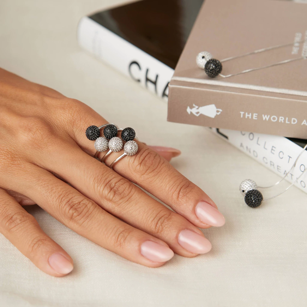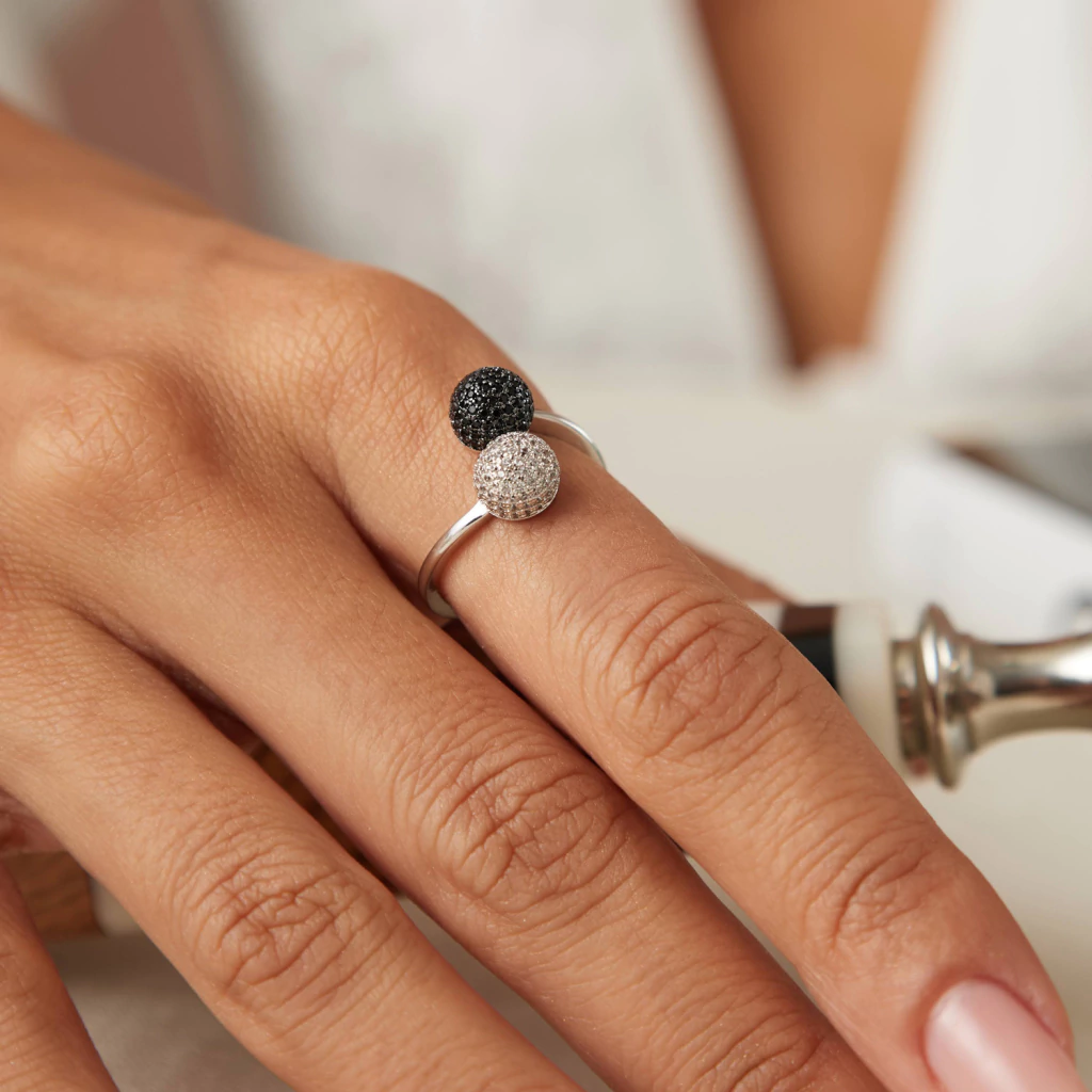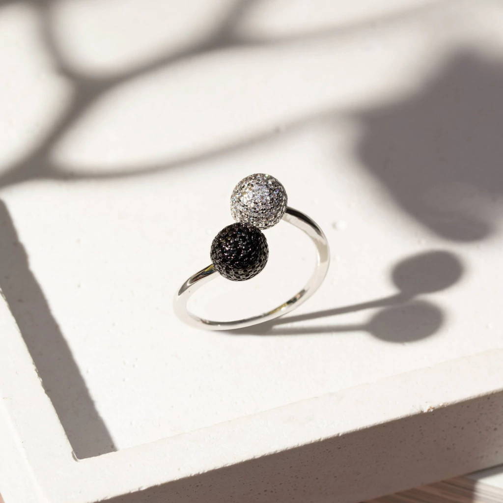 Anel aro aberto, ajustável, com duas meia esferas cravejadas por zircônias.