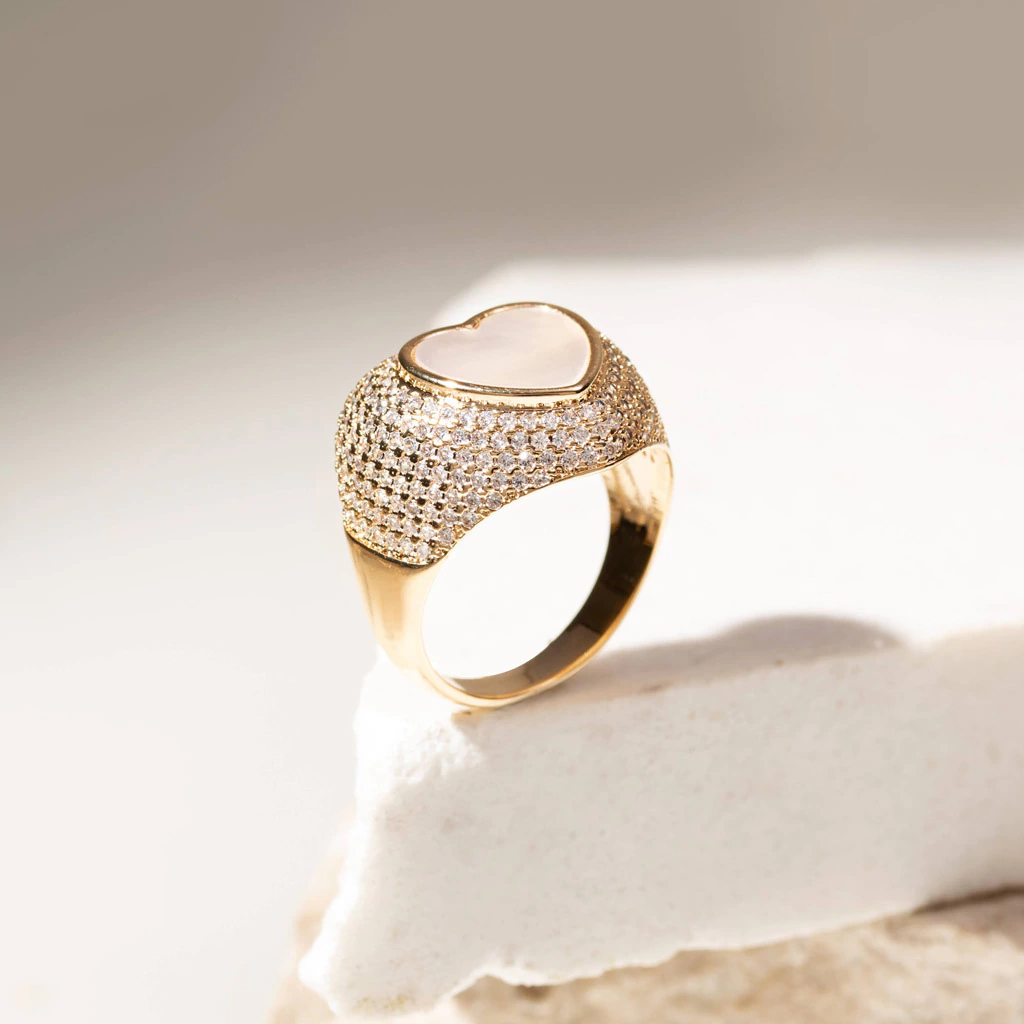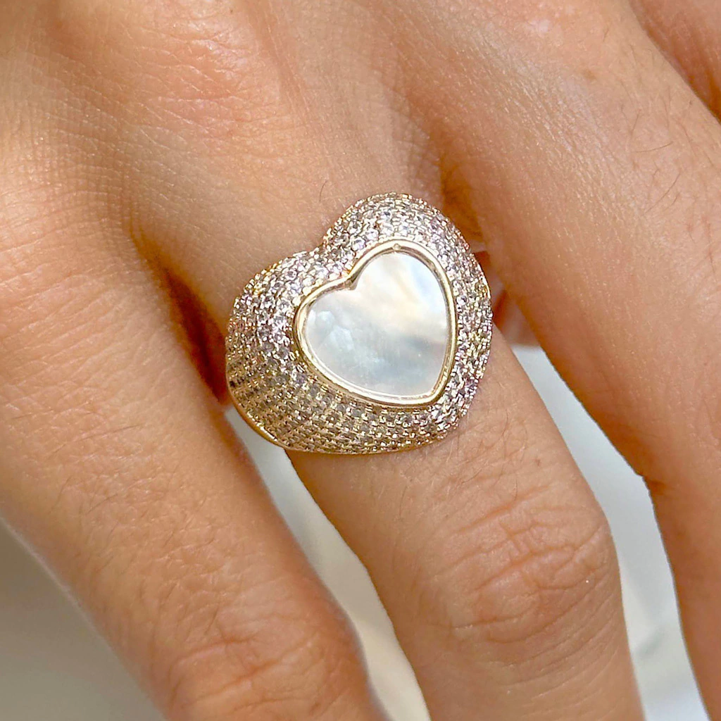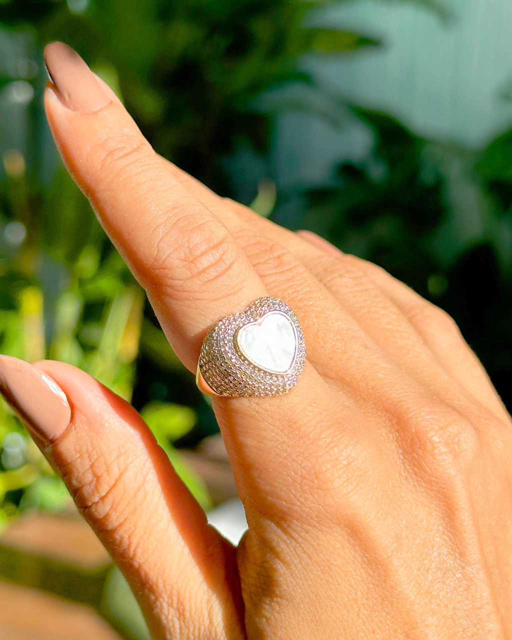 Anel coração madrepérola, aro cravejado com zircônias de alto brilho.