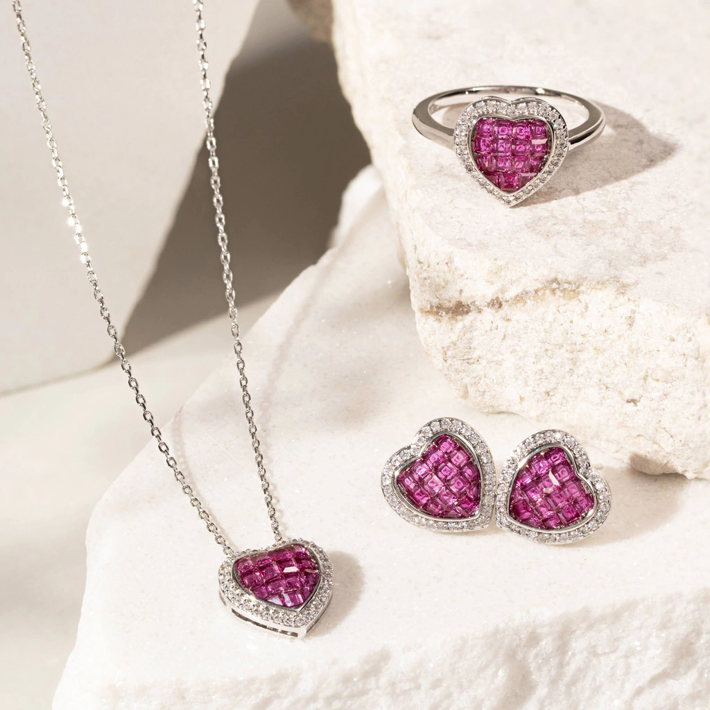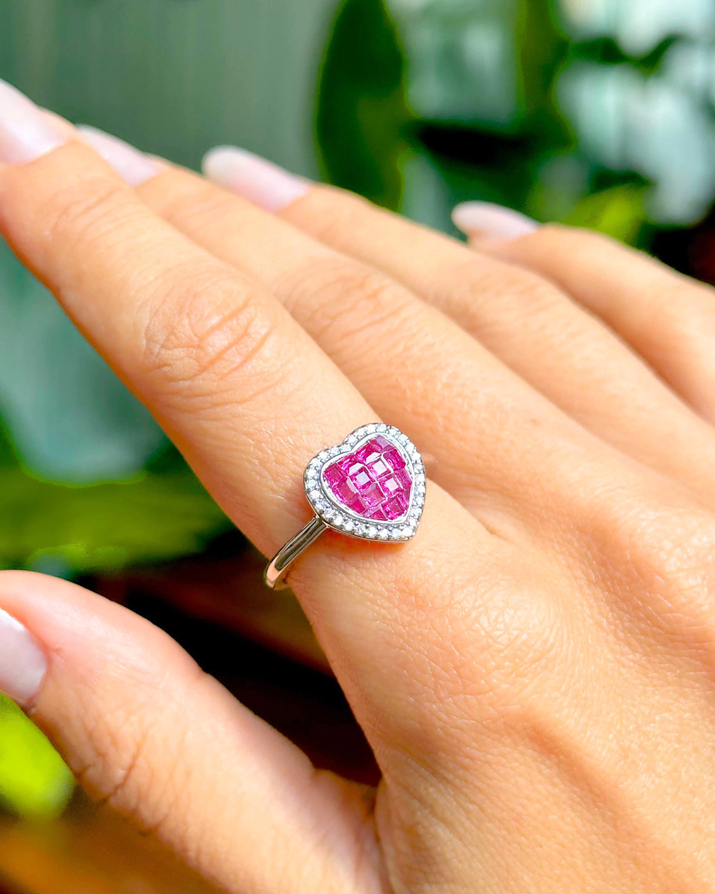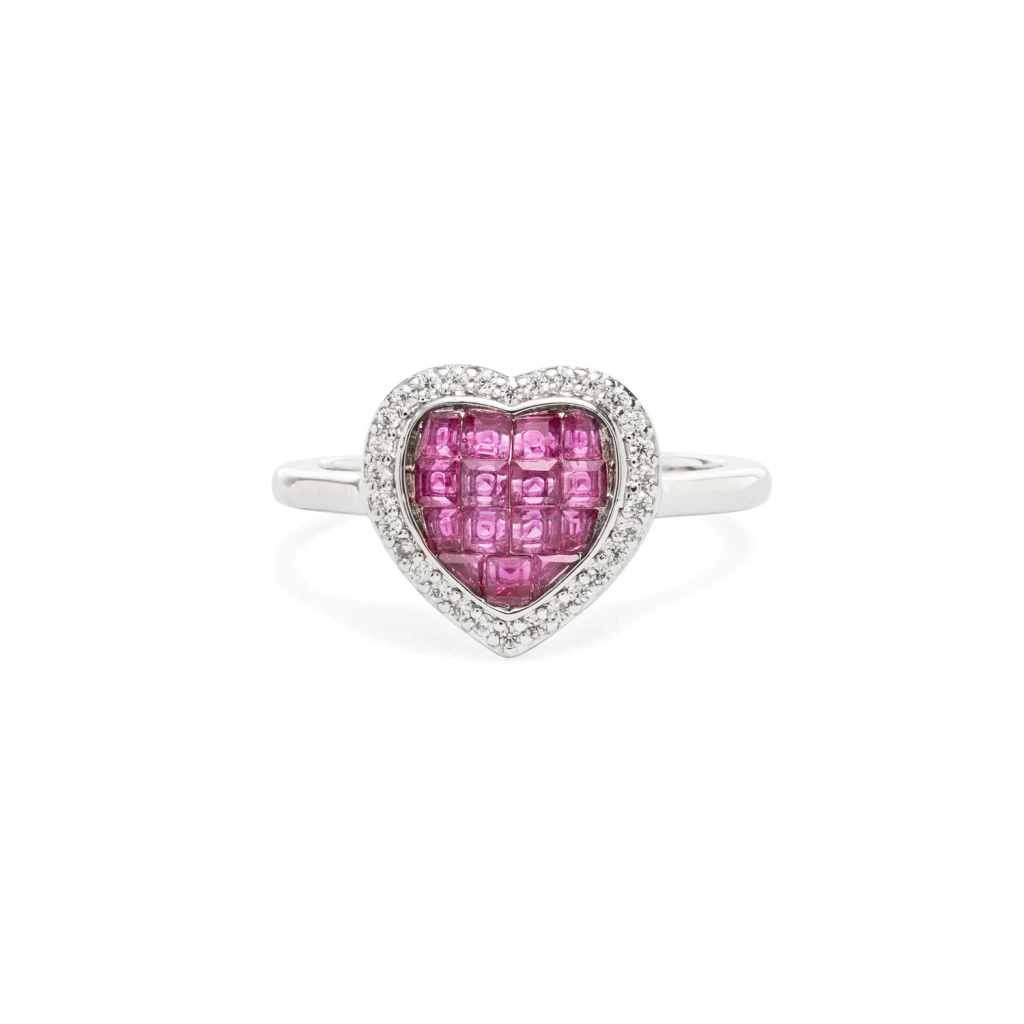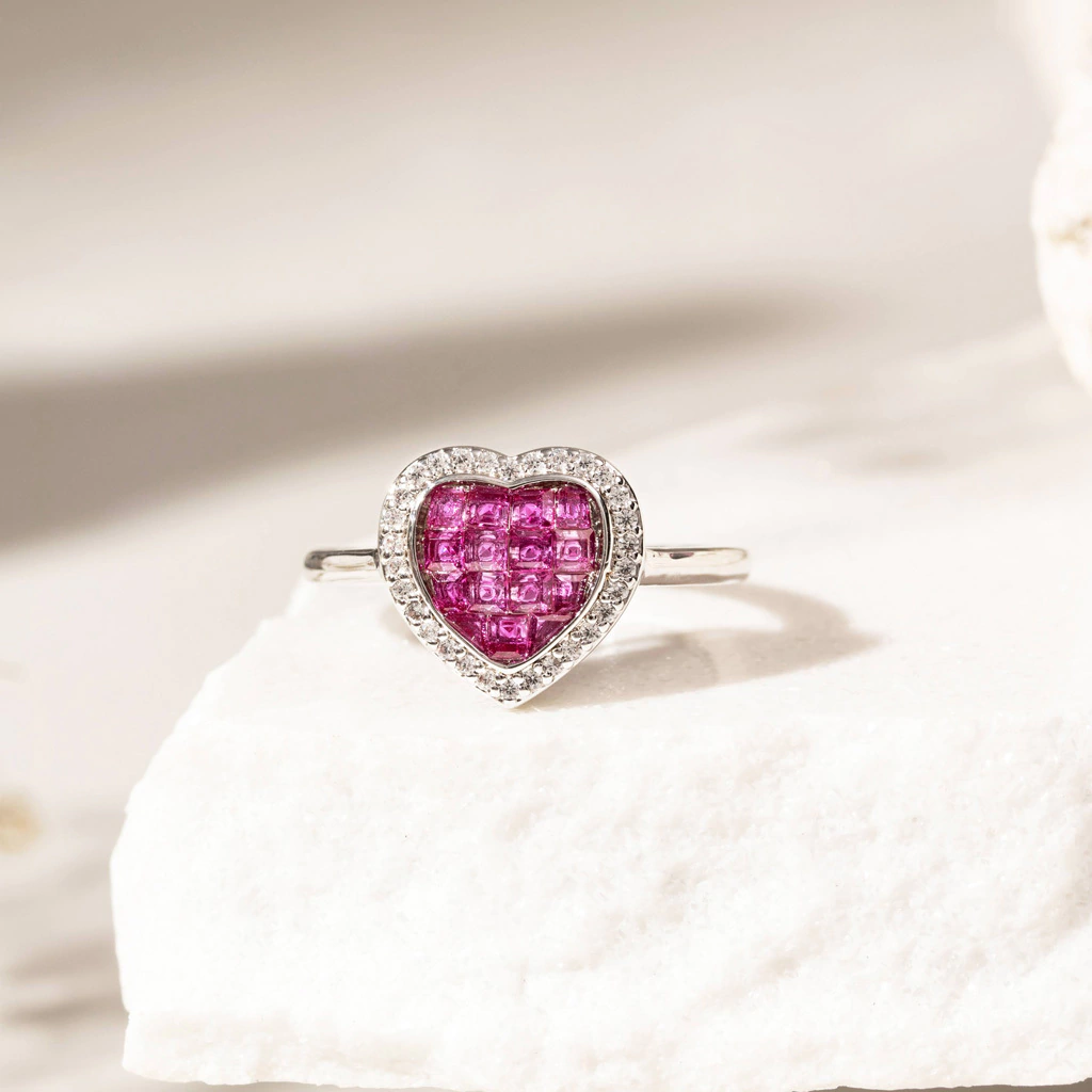 Anel com pedra coração estilo cravação invisível, inspirada na mais alta joalheria.