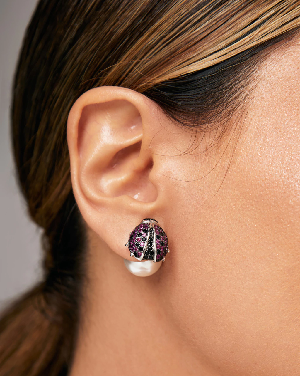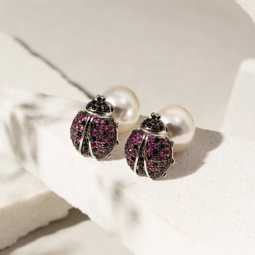 Joaninha: zircônias negras e vermelhas, com opção tarraxa comum e tarraxa em pérola shell.