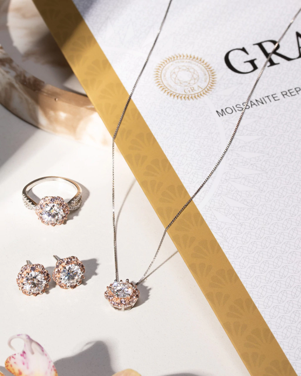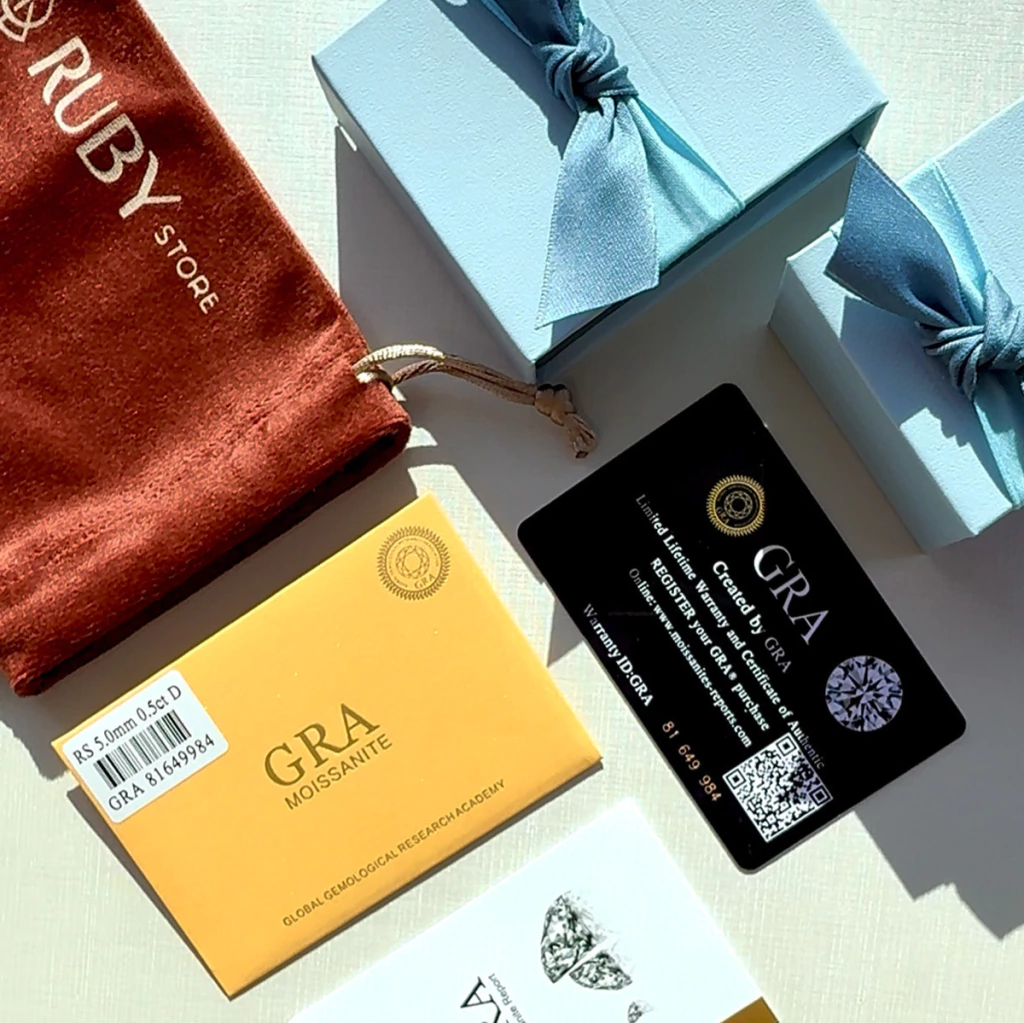 Todas as nossas joias com moissanite acompanham o certificado GRA (Gemological Research Association), que atesta a autenticidade e qualidade da pedra.