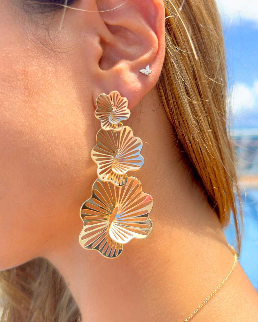 Brinco longo floral vazado, peça leve e de visual oponente.