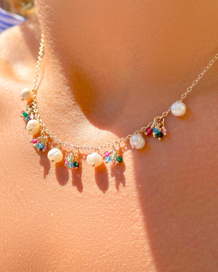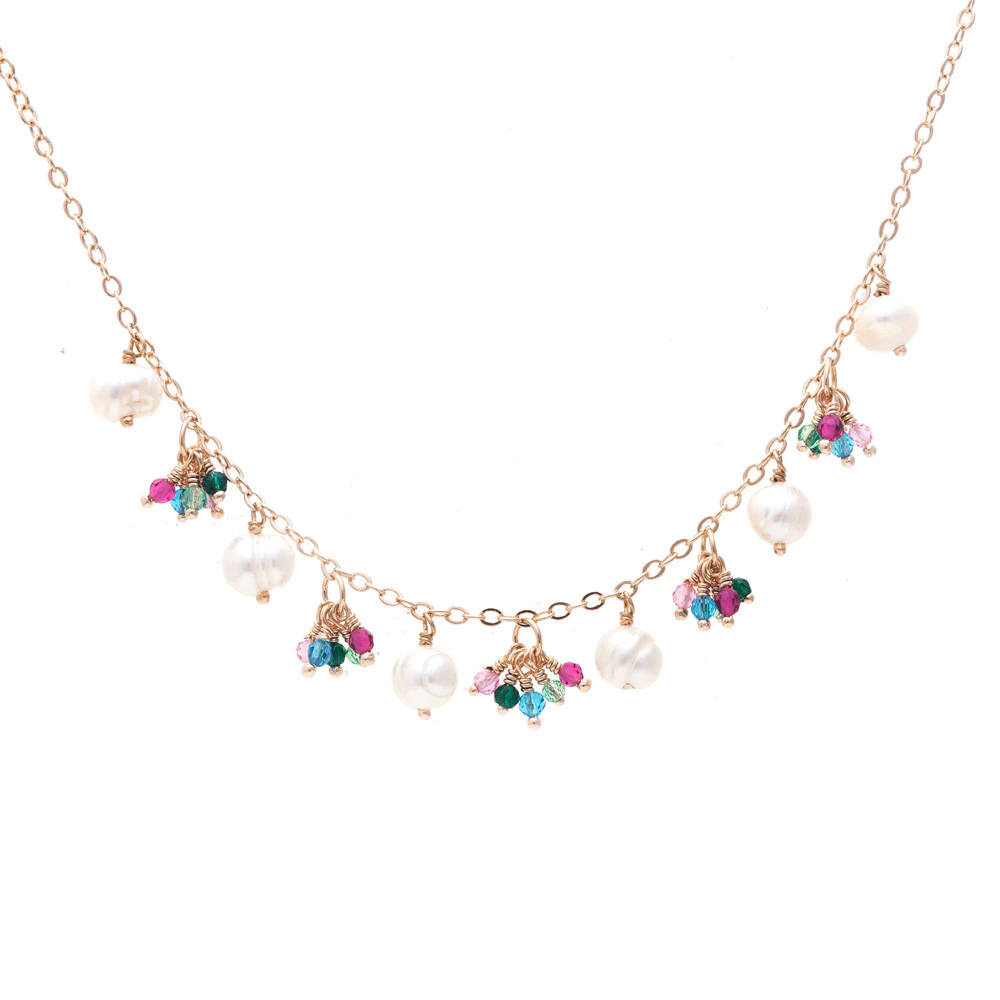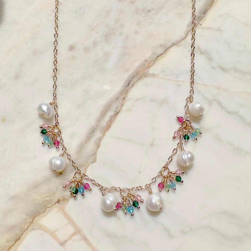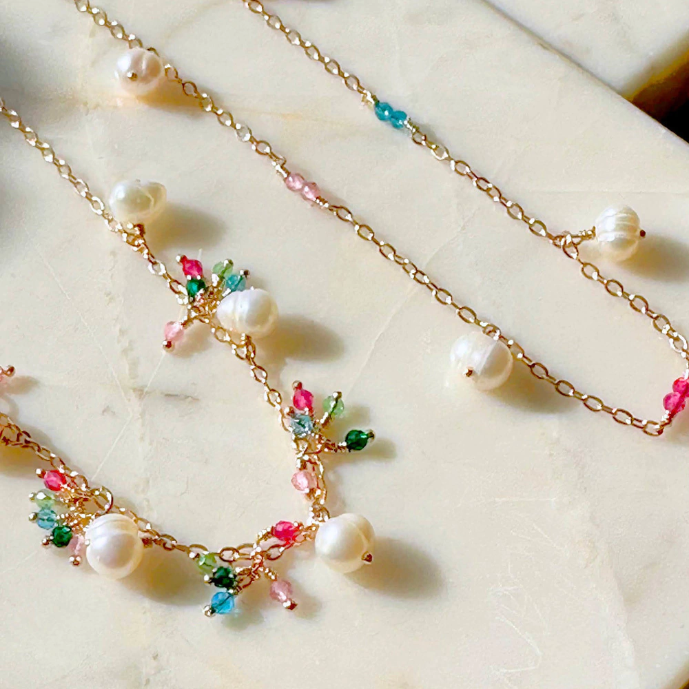 Cristais búlgaros coloridos e pérolas de água doce.