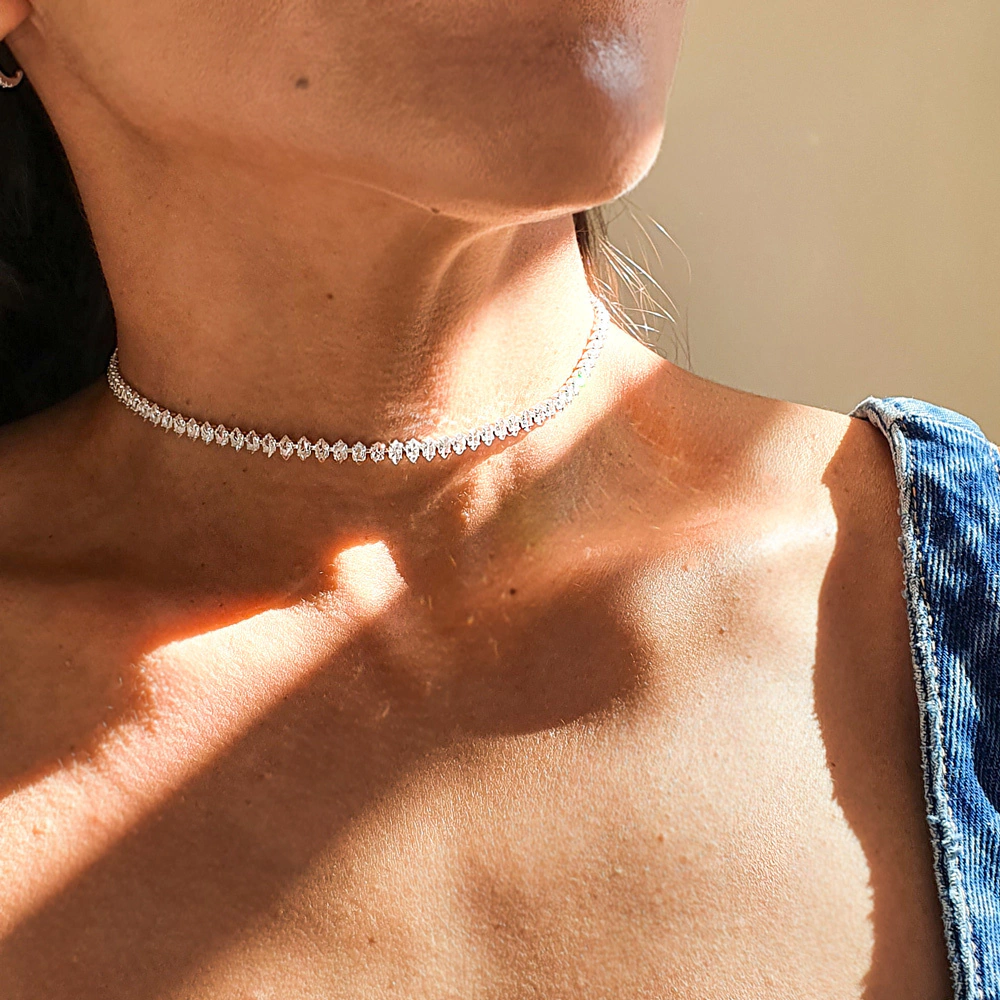 Colar choker riviera de pedras cristais zircônias navetes de alto brilho, com acabamento de joia