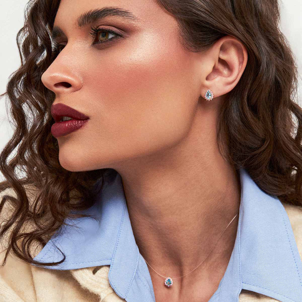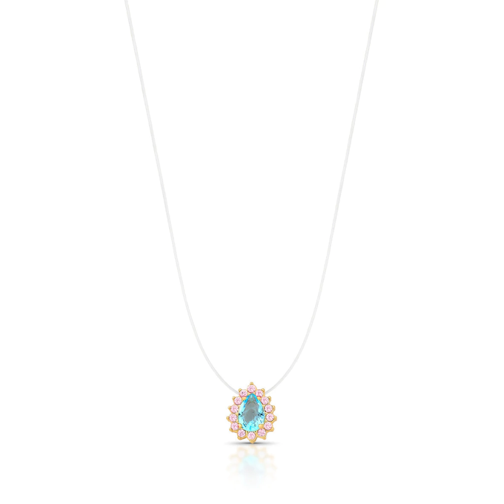 Gota zircônia cor topázio azul, bordada por cristais cor safira rosa.