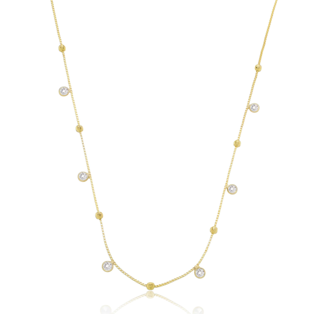 Pedras zircônias intercaladas com bolinhas banhadas a ouro.