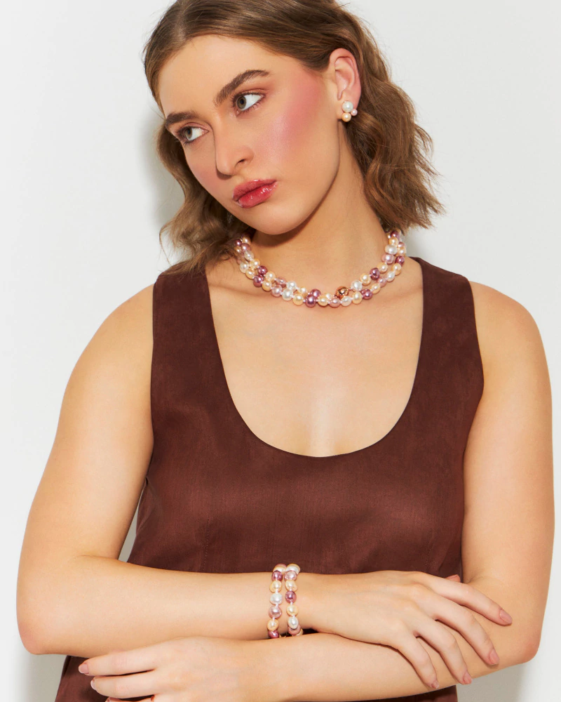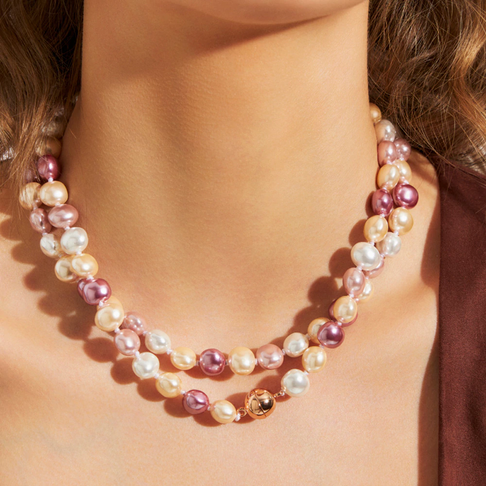 Colar pérolas shell de água doce em tons rosados.