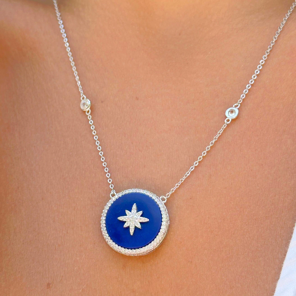 Borda, lateral e estrela central do pingente cravejadas por microzircônias de alto brilho.
