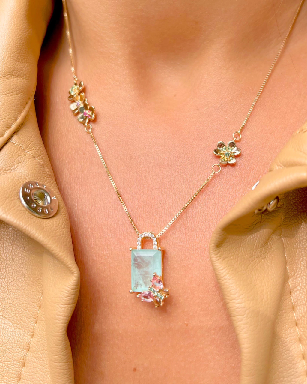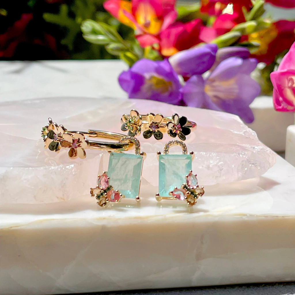 Brinco delicado de pedra turmalina com borboleta e flores.