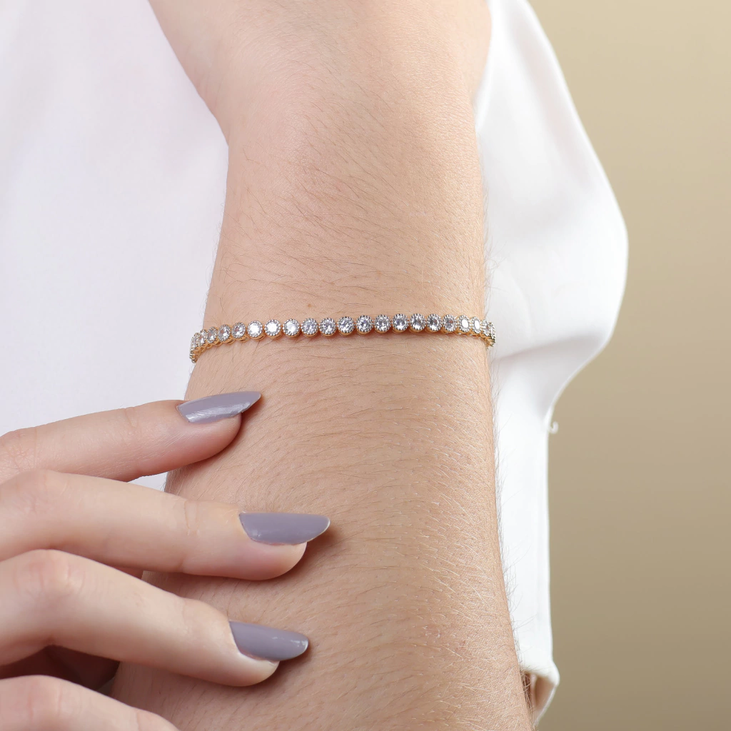 Pulseira riviera de zircônias com delicada carretilha, fecho joia com trava pega-ladrão.