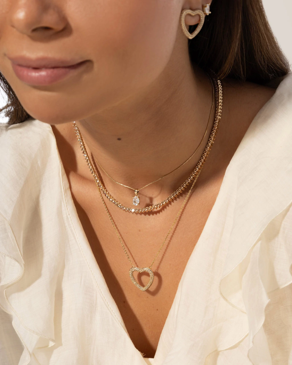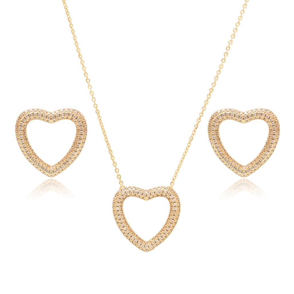 Conjunto colar e brinco coração cravejado por zircônias champanhe.