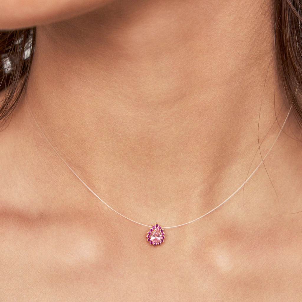 Gota zircônia cor safira rosa, bordada por cristais zircônias pink.