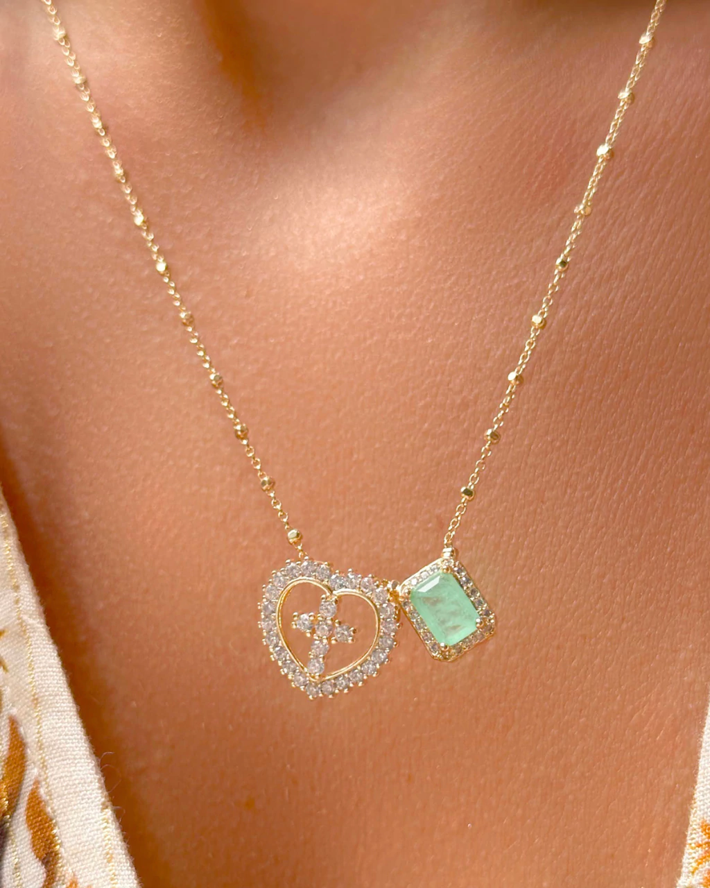 Pingente móvel coração com cruz em zircônias tamanho 15 x 15 mm.Composição: banhado a ouro.