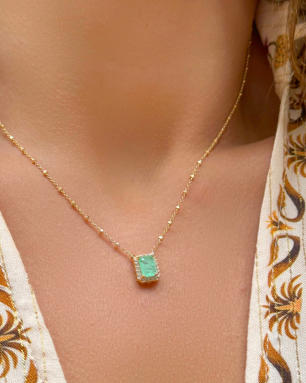 Pingente pedra cor esmeralda colombiana com zircônias tamanho 10 x 7 mm.