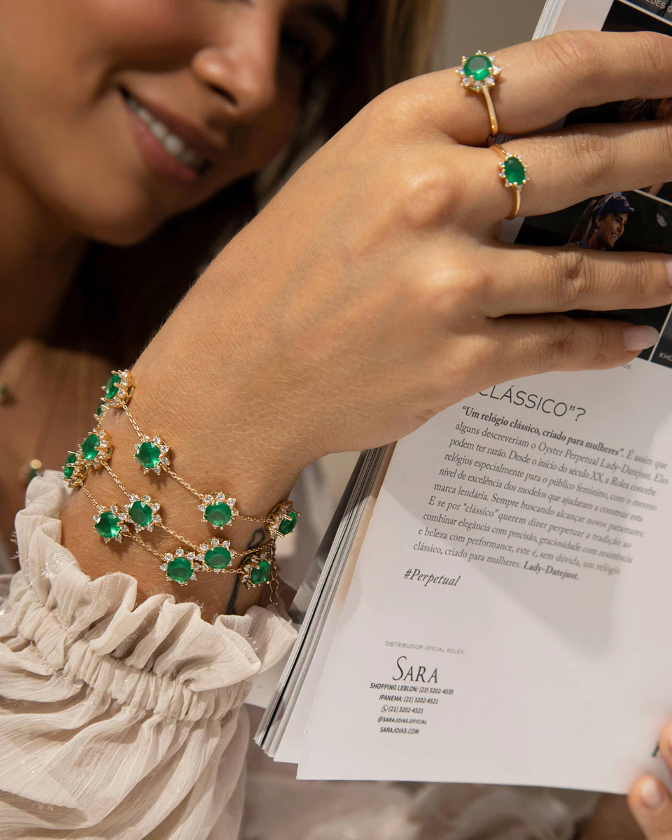 Pulseira pedras redondas cor esmeralda, com zircônias de alto brilho.
