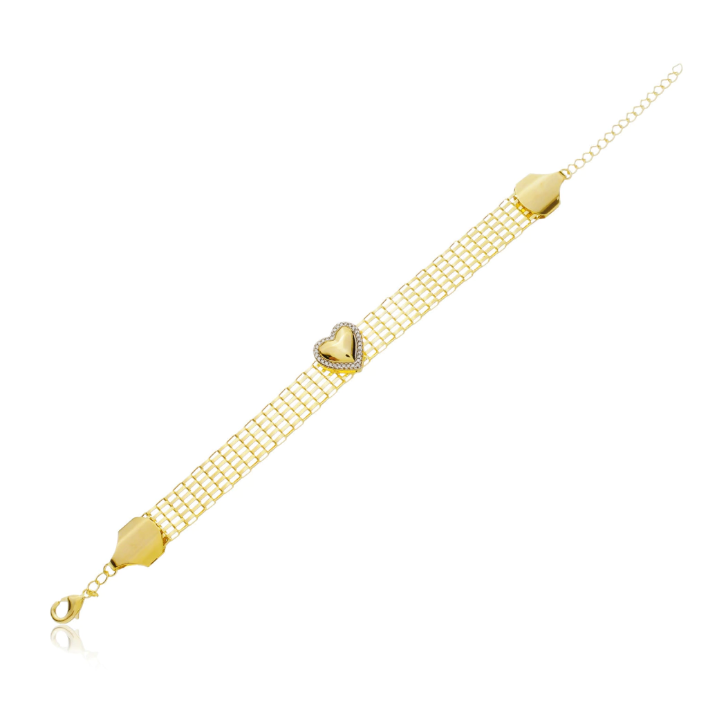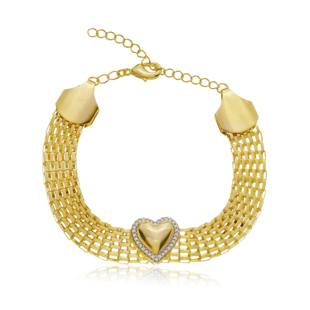 Coração central com zircônias, tamanho 14 x 14 mm.