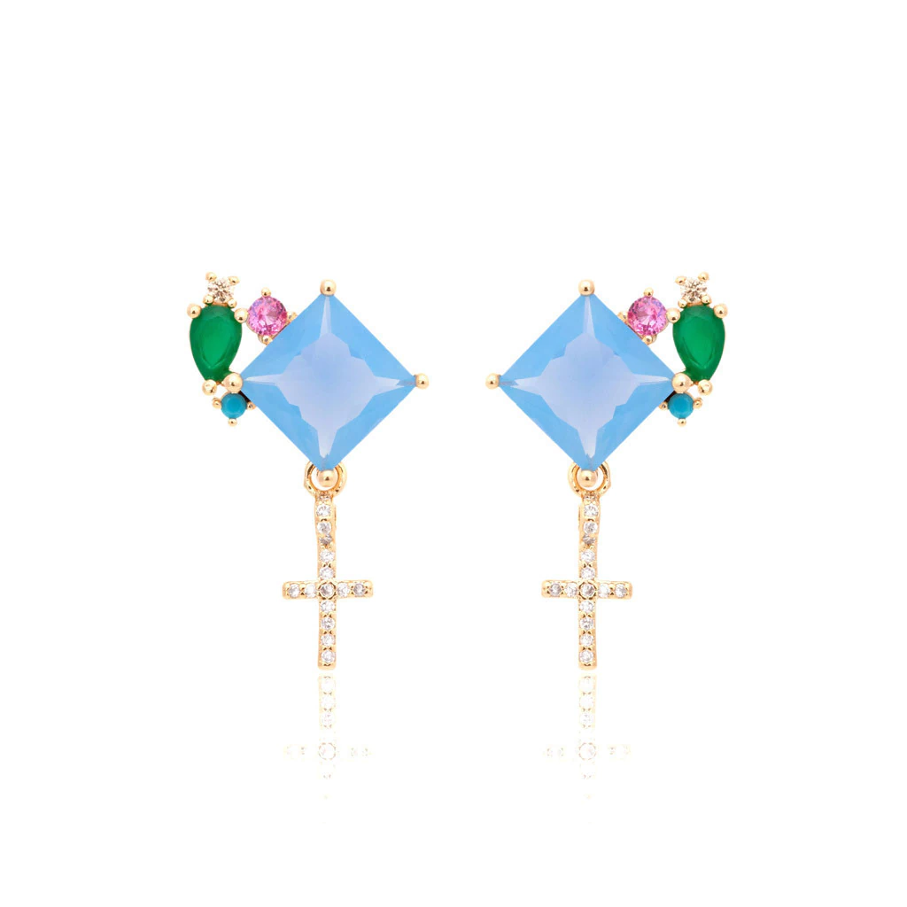 Brinco pedra fusion quadrada cor azul opala azul com cristais coloridos.