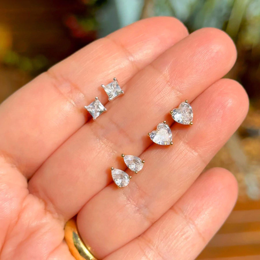Trio de brincos cristais zircônias alto brilho pontos de luz.
